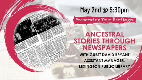 David Bryant, Assistant Manager at the central office of our sister Lexington Public Library system, will be joining us this May for a look at how to discover your ancestors' stories using historical newspapers. Local newspapers are often cataloged in libraries as microfilm, microfiche, or in digital format, and provide an incredible view back on the lives and times of those who came before us!